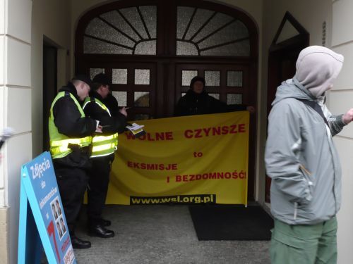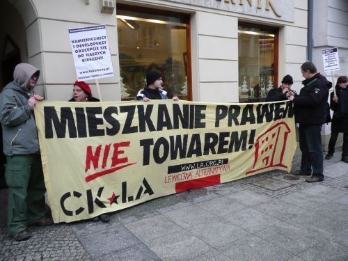 Protestujący przynieśli transparenty "Wolne czynsze to eksmisje i bezdomność" (WSL) oraz "Mieszkanie prawem nie towarem" (LA).