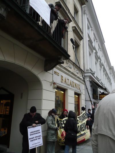 W związku z tym blokada odbywała się przed wejściem do budynku i została połączona z pikietą sklepu należącego do kamienicznika Wojciecha Bazarnika znajdującego się w tym samym budynku.