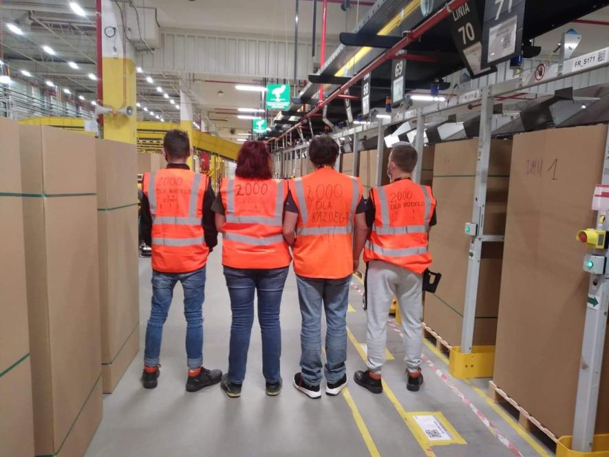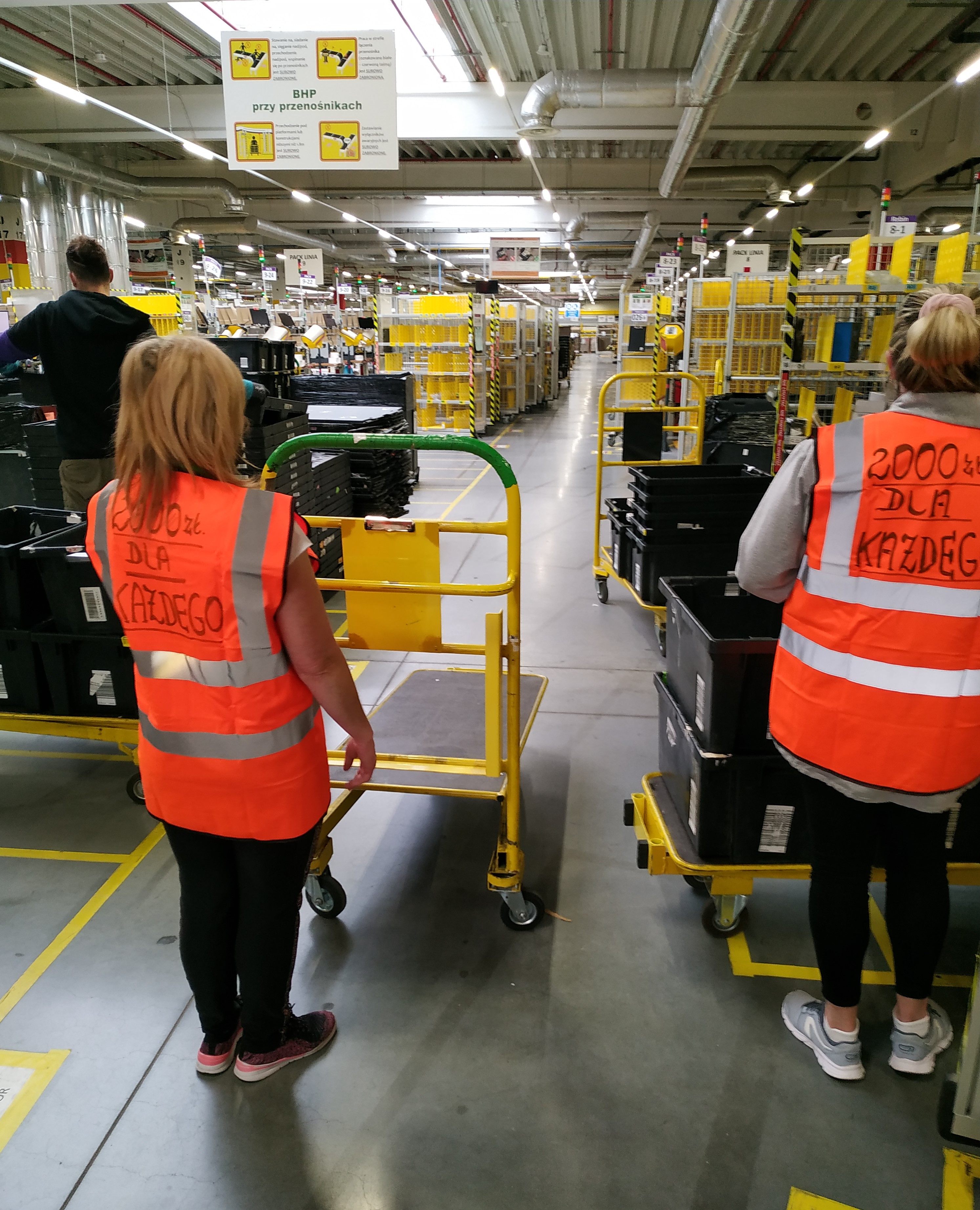 Inicjatywa Pracownicza otrzymała nagrania, na których widać protest operatorów wózków widłowych z magazynu Amazon pod Wrocławiem. Na dziale rozładunku i załadunku (dock i ship) na zmianie dziennej w proteście wzięło udział ok. 115-130 wózkowych (czyli zdecydowana większość operatorów z tych działów). Jak relacjonuje jeden z uczestników: „Protest polegał na tym, że wszyscy pracownicy zjechali w jedno miejsce i przez ok. trzy minuty włączali klaksony. Osoby solidaryzujące się z nami doszły do nas na znak protestu. Wywarło to wielkie wrażenie wśród innych pracowników magazynu. Oczywiście zaraz zlecieli się managerowie i osoby z HR. Na zakończenie trzy razy krzyknęliśmy „2 tysiące dla każdego!”.
