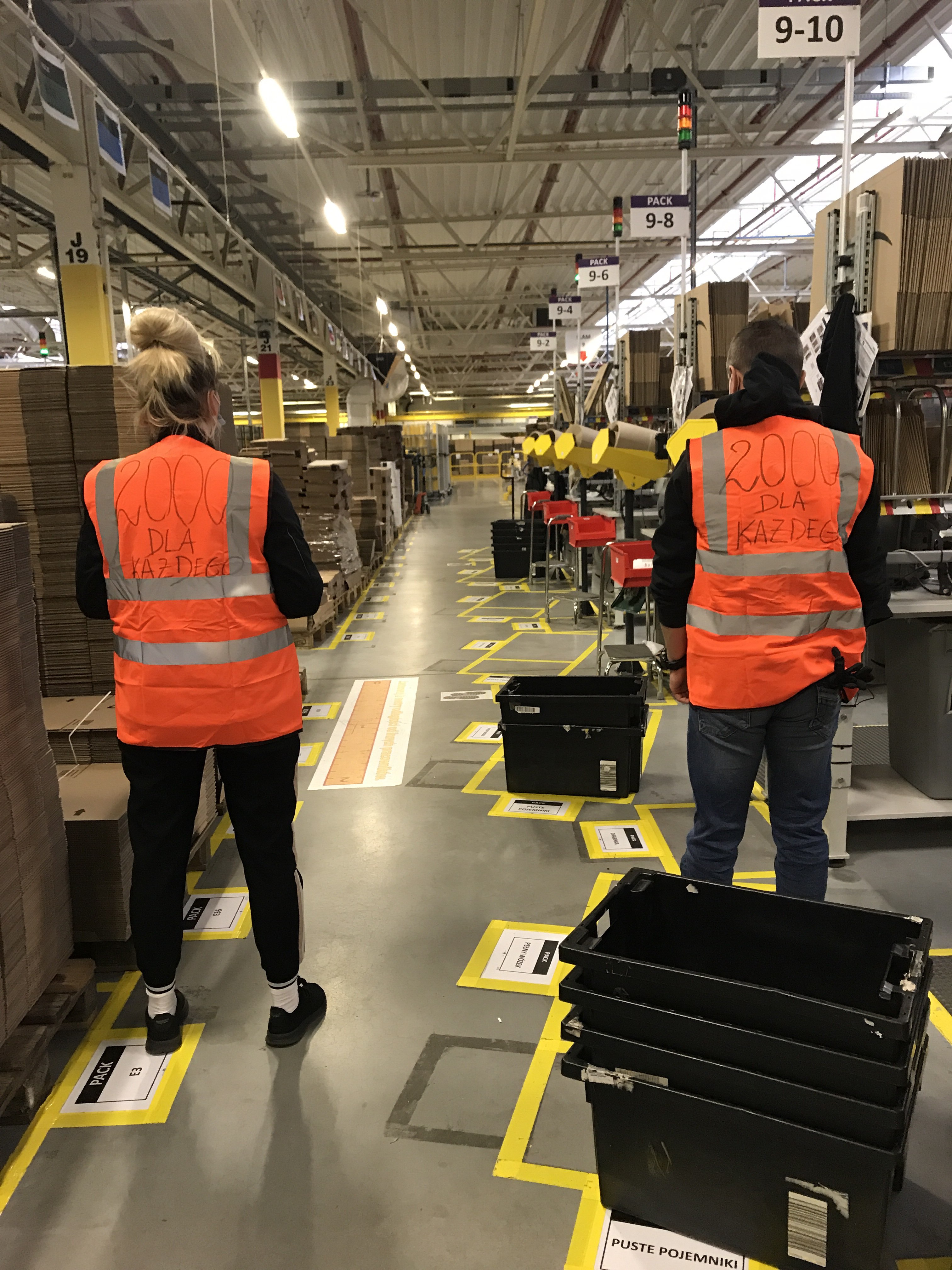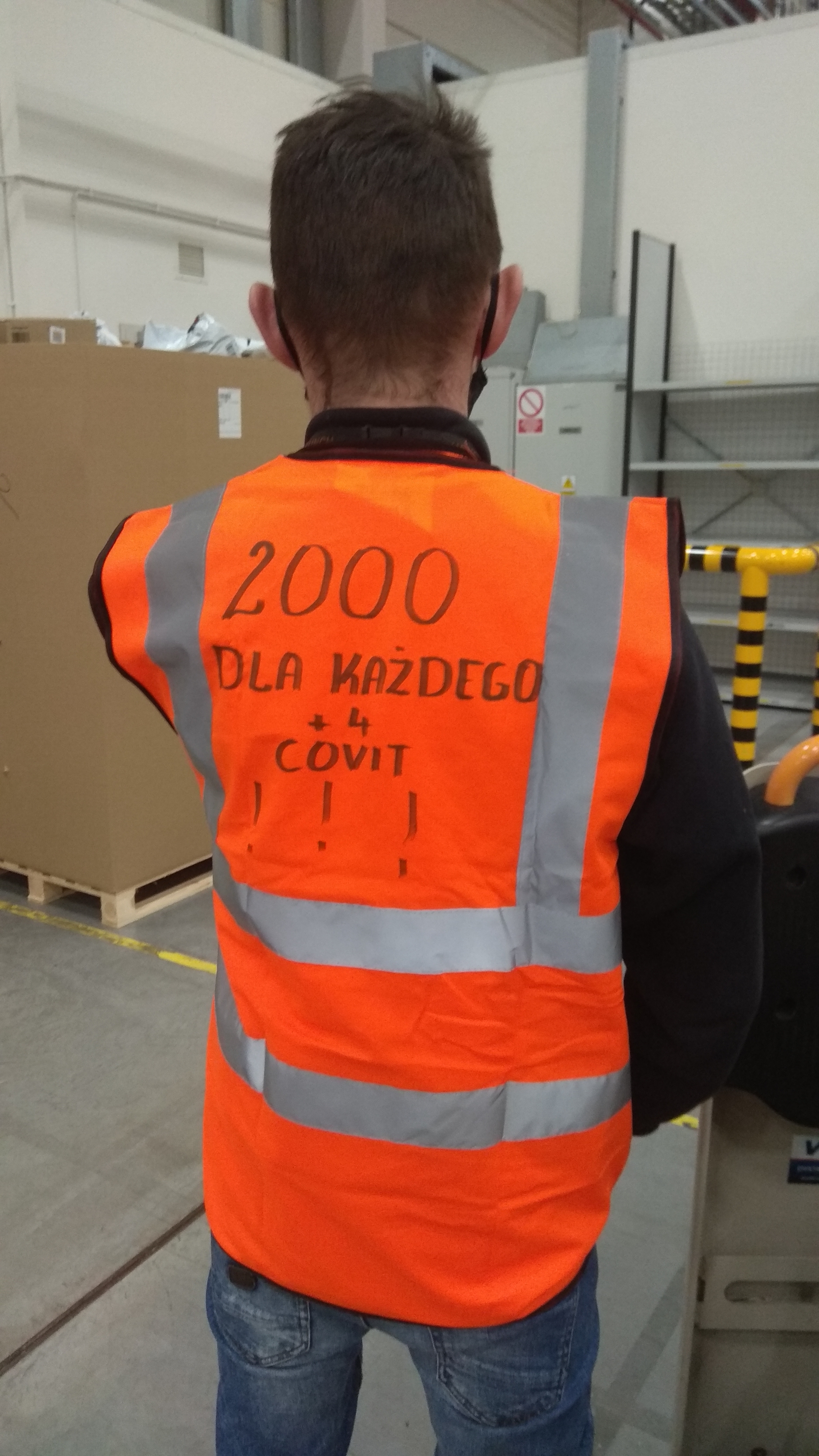 Z tego powodu po 5 listopada 2020 r. doszło do serii oddolnych akcji protestacyjnych polegających na przestojach w pracy, trwających od kilku minut do godziny. Inni wyrażali sprzeciw nosząc w pracy pomarańczowe kamizelki z własnoręcznie wykonanym napisem „2 tys. zł dla każdego”. Można było je zobaczyć w Amazon w Sosnowcu, Sadach pod Poznaniem, Kołbaskowie i w Bielanach pod Wrocławiem. Pracownicy nadsyłali zdjęcia i wzywali innych do działania: „kto nas popiera, niech też taką kamizelkę ubiera!”.